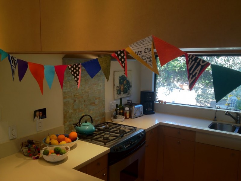 We didn’t really have a birthday party this year—just a Wii playdate. He requested Star Wars cupcakes with little Luke Skywalker flags. I made Barefoot Contessa’s coconut cupcakes sans the coconut and he asked that I hang the birthday banner—the plastic banner I bought at the Dollar Store three years ago and have hung every year. But I threw it out last year because it was all wrinkly. So I had to think fast and I whipped up this 12 minute birthday bunting with felt and fabric scraps. It was super easy because of the lack of order or straight lines! I just cut random triangles, zigzaged some black and white fabric to a few of the triangles, and attached t-shirt yarn string at each end. Very festive and easy and weirdly hip even though that wasn’t my goal.