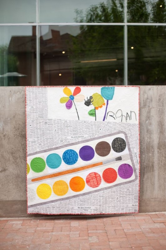 In the midst of getting stuff ready for any deadline, it can sometimes be a mild panic/freak-out/rush. Sally might attest to that. Wonderful Laura Jaquinto (my new BFF) over at Windham Fabrics has held my hand through the whole process of developing my first fabric line. She has begun to intuit my urges and instincts, rather like observing a wild animal in its habitat. She knew I was freezing-up (due to being overwhelmed) when it came time to produce all the quilts and samples with my fabric, so she rounded up Sally Keller to help test a mostly-written pattern for me: the Watercolor Quilt. This quilt depicts a huge watercolor tray laid out on newspaper and in the upper right corner is a sheet of paper containing a child’s watercolor painting and signature (the art is all raw edge appliqué but the tray and background and paper are all pieced).
