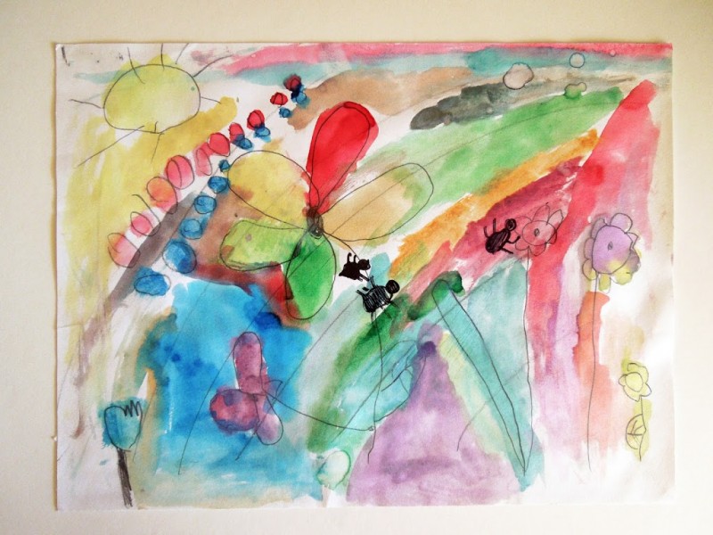 Allow me to insert (un-modestly) here: I LOVE THIS QUILT. I am proud of it and excited to share it. Every time I show it to someone they either tell me they have chills, or they cry. You know you are up to something good when people get chills or cry. 🙂 It is a special quilt and each one will be different because you can use the flowers and bugs I provided or better yet, in the pattern I describe how you can interpret your own child’s artwork in exactly the same manner as mine, so you can preserve their art in a quilt. What sewing parent or grand-parent wouldn’t want to do that, right? My inspiration for the artwork in the Watercolor Quilt was one of my son’s kindergarten drawings…