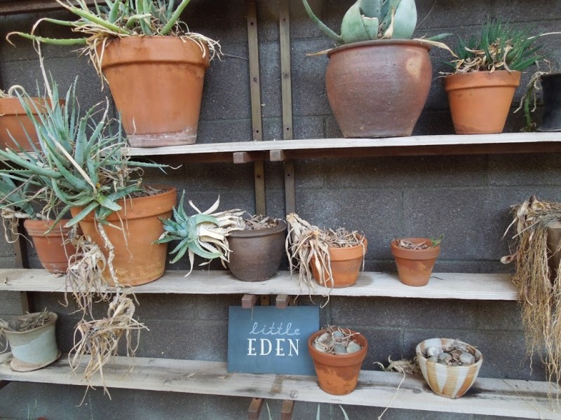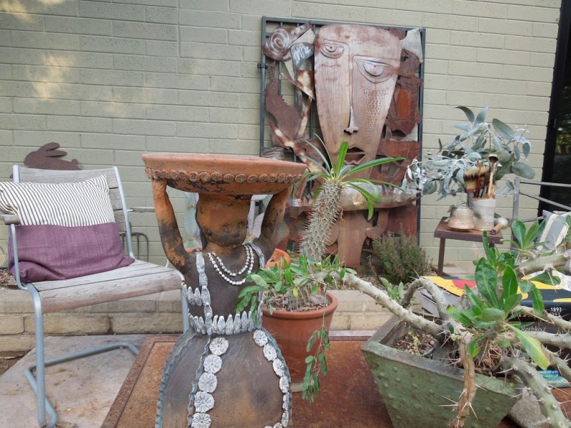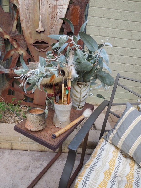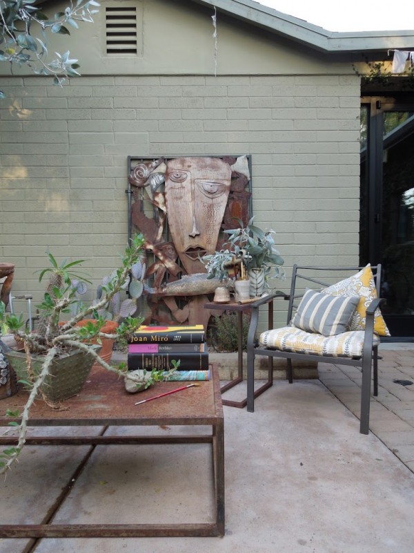 Today was the first backyard day in the desert. Fall is finally here. We cleaned all day–removed a zillion spider webs, trimmed everything in sight, and hosed it all down. The inside of our house is now fragrant and full of eucalyptus branches in vases. We even made this impromptu outdoor living room. Isn’t that metal gate awesome? I can’t remember the artist’s name—I think he’s from Utah.