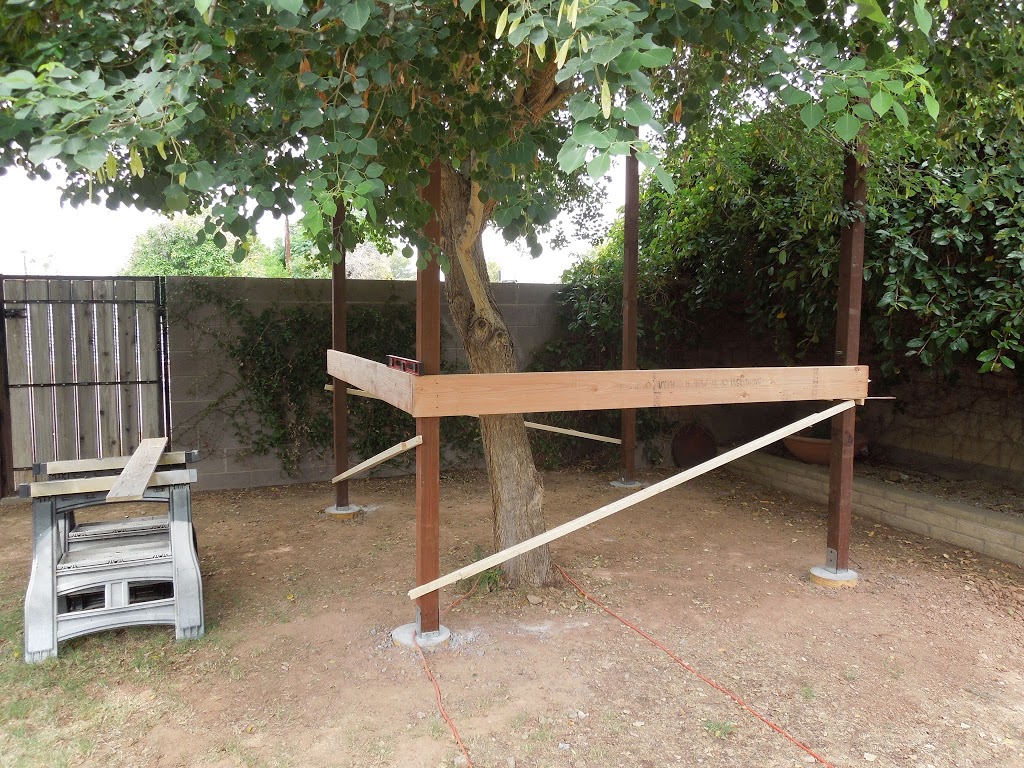 The tree houses measures 9′ x 9′. It is 4′ off the ground. We wanted the above branches to be the roof instead of creating a roof that would separate us from the tree. It is meant as a space to play, to hang out, an open-ended space. Our Sissoo tree is only about five years old. It is too young and small to support the fort, so we built a deck around it.