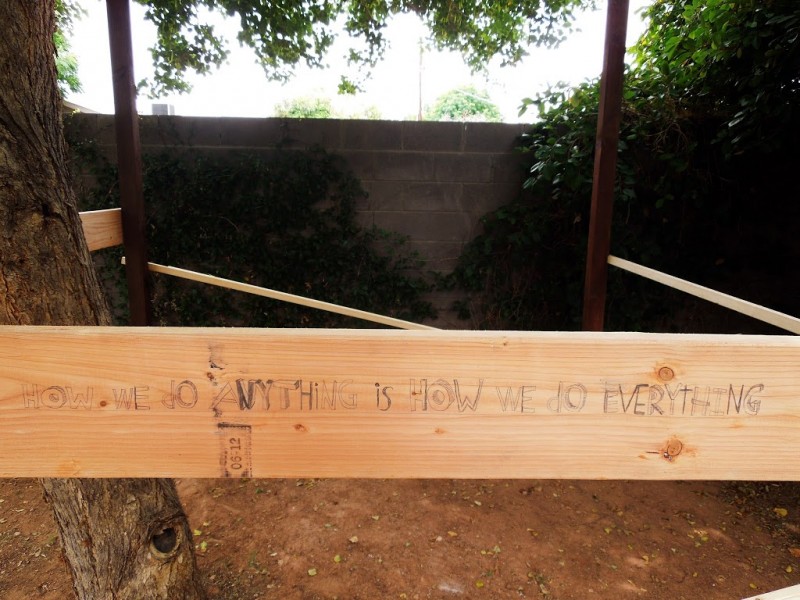 “How we do anything is how we do everything.” Our outlook as we work on a tree fort is a mirror of our attitude towards how we do anything. Are we optimistic or pessimistic? Sloppy? Graceful? Grateful? Leisurely? Calm? Excited? In my life this year I am working to be in balance with the place of grace and ease combined with the place of work and effort. If we don’t put in effort then it all falls apart–and we are lazy. If we put in too much effort and lose our ease then we are hamfisted, too forceful and controlling. This is a life’s work. We are a continuum of spirit and thought. We can have our feelings but need to be mindful that there is no there, there. It is all here–all right now–this moment–now this moment. So that mindfulness quote was a strategic inspiration as we fumbled our way through the warped wood pile.
