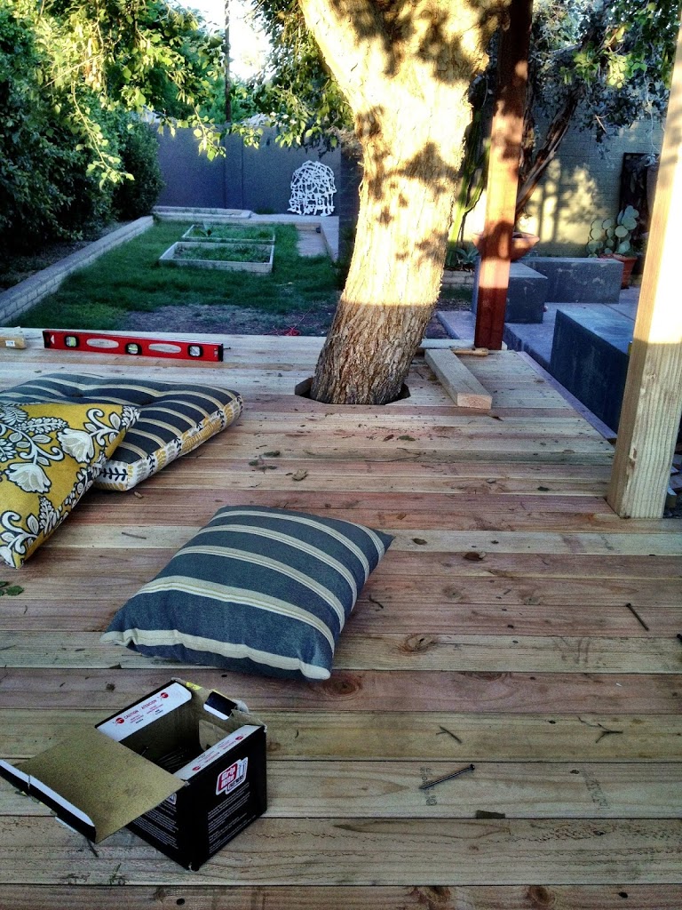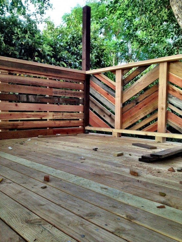 The design process was intuitive and unplanned (as is most stuff in my life). I designed on post-it notes as we worked. I even designed on the back of a birthday party invitation and then missed the party because it was pinned to the wall face-down. I knew I wanted the front railings to be interesting and we negotiated about how to do that. We finally landed on this broken chevron pattern in reused wood and I am so happy with it. It looks like Missoni in lumber!!! The pictures don’t do it justice because you can’t feel the slight breeze, or see the cicada sheds on the tree trunk, or feel the earth coming up through the tree, or see the leaves moving and the light dappling. It is like a vacation in the backyard.