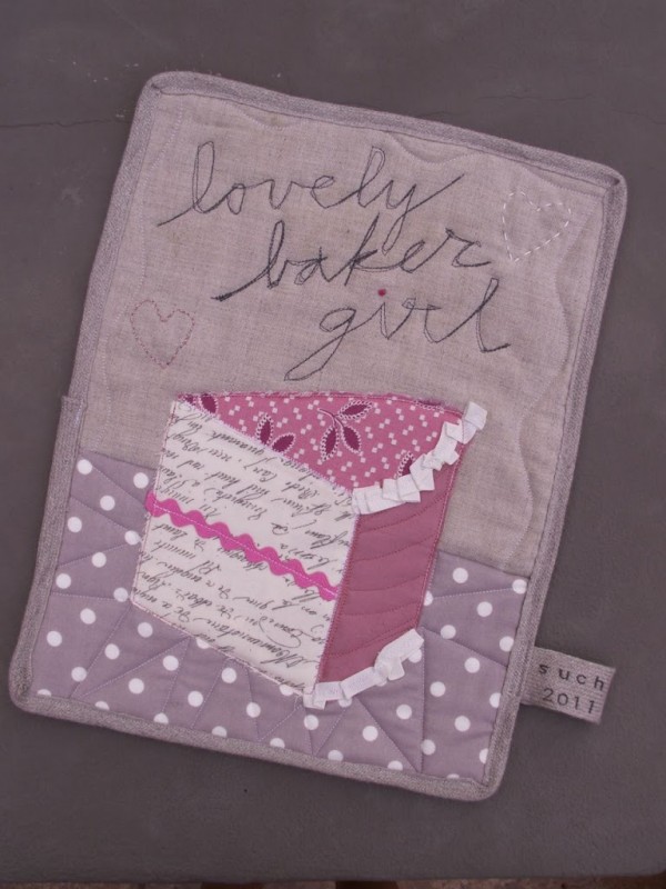When the creative act takes over sometimes I forget to do some basic planning…like measuring, for example! This would-be pot-holder is now probably a trivet. But it says, “lovely baker girl” on it for my lovely baker girl friend. I like the ric rac raspberry filling and the crumpled ribbon frosting. (Don’t look too closely at the binding. I attached in about five minutes and didn’t even pin it so it is super wavy and crooked.)